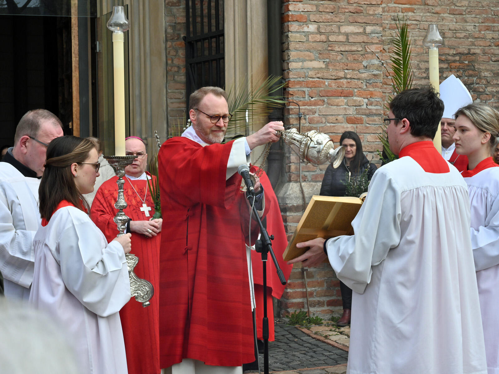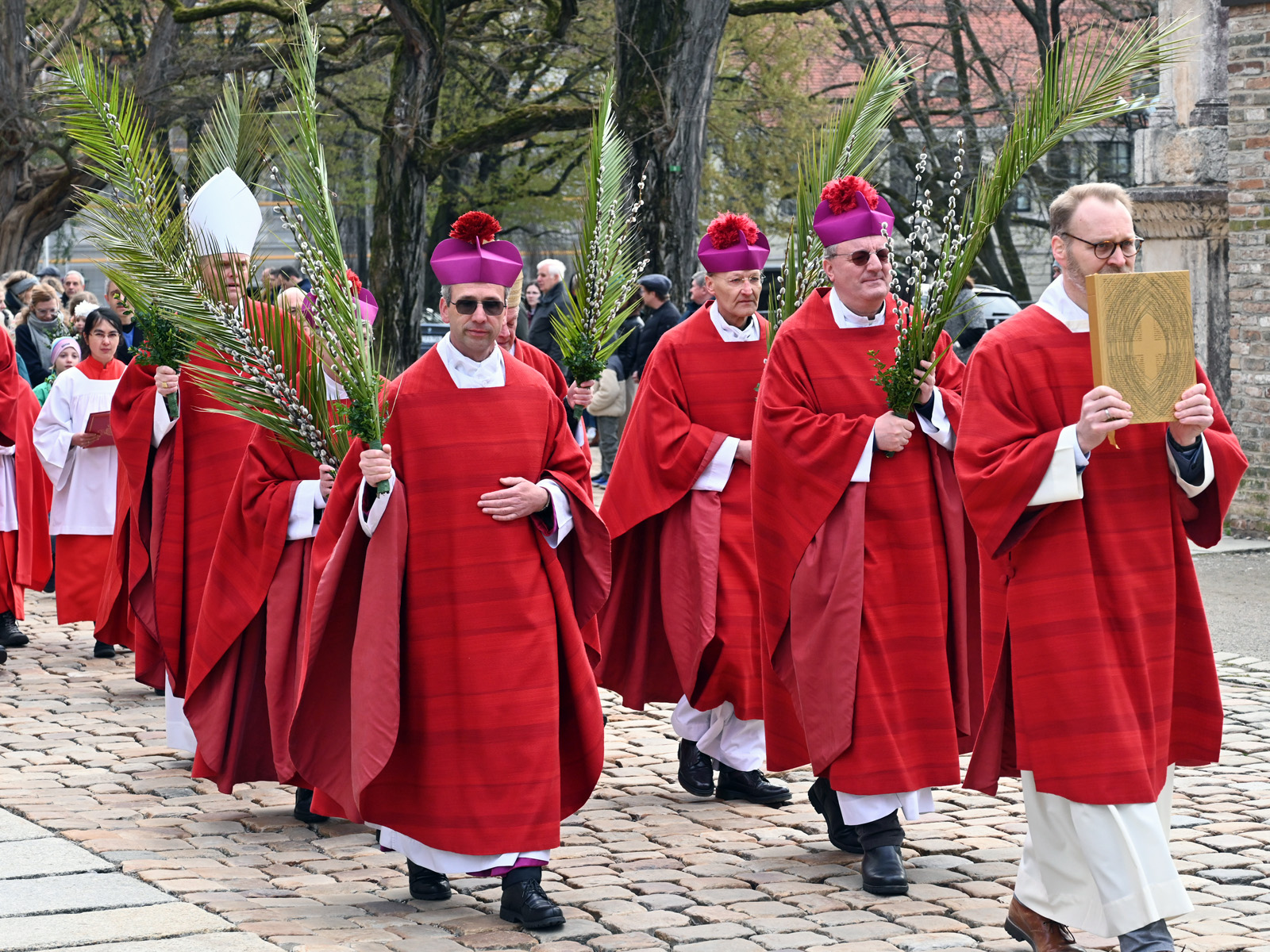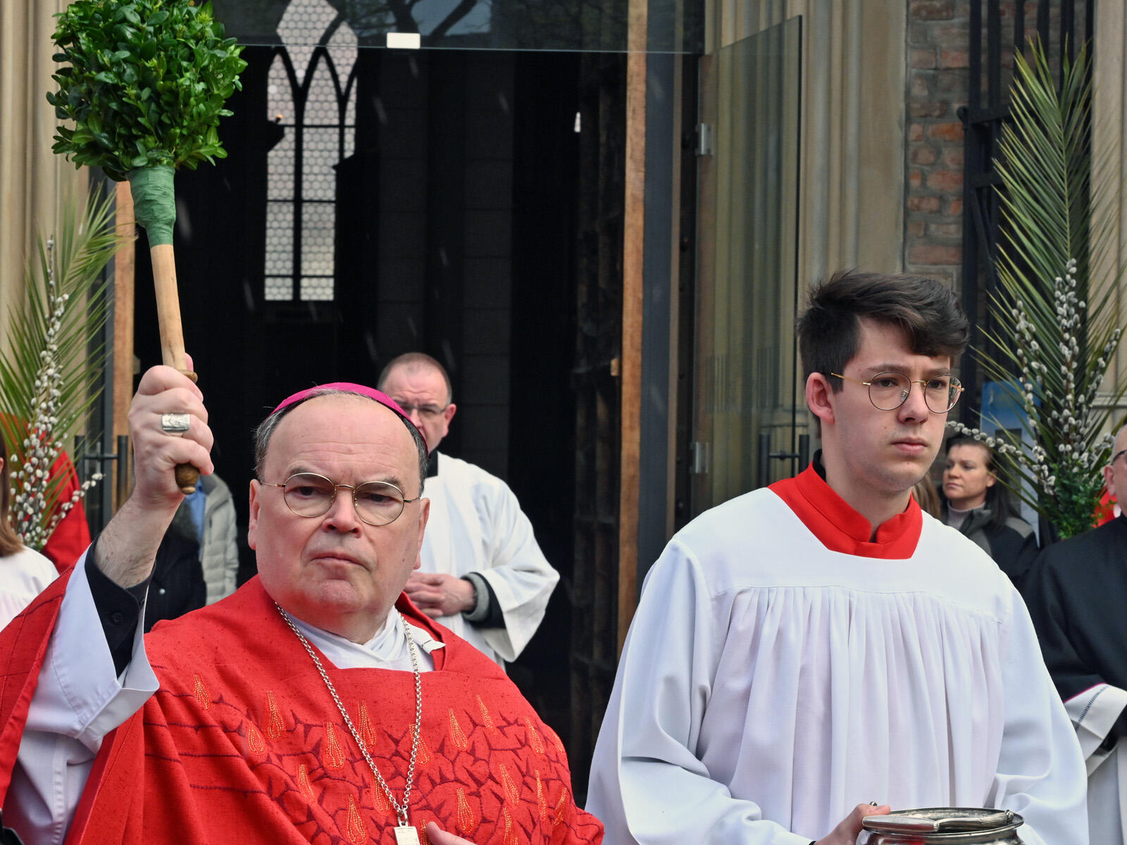 Trotz des eher trüben Wetters hatten sich zahlreiche Gottesdienstbesucher vor dem ansonsten verschlossenen Bronzeportal des Doms versammelt, um mit der gemeinsamen Prozession in die Kathedralkirche hinein liturgisch an den Einzug Jesu in die heiligste Stadt des Judentums anzuknüpfen. Gemäß jahrhundertealtem Brauchtum segnete der Bischof unter den Klängen des „Hosanna filio David“ auch die Palmzweige. Diese Tradition knüpft an die biblische Überlieferung an, in der es heißt, dass die Menschen Jerusalems Palmzweige von den Bäumen schnitten und auf dem Weg vor Jesus ausbreiteten (Mt 21,8). Die Palmbuschen werden traditionell im darauffolgenden Jahr im Osterfeuer verbrannt. Deren Asche wird bei der Austeilung des Aschekreuzes genutzt.