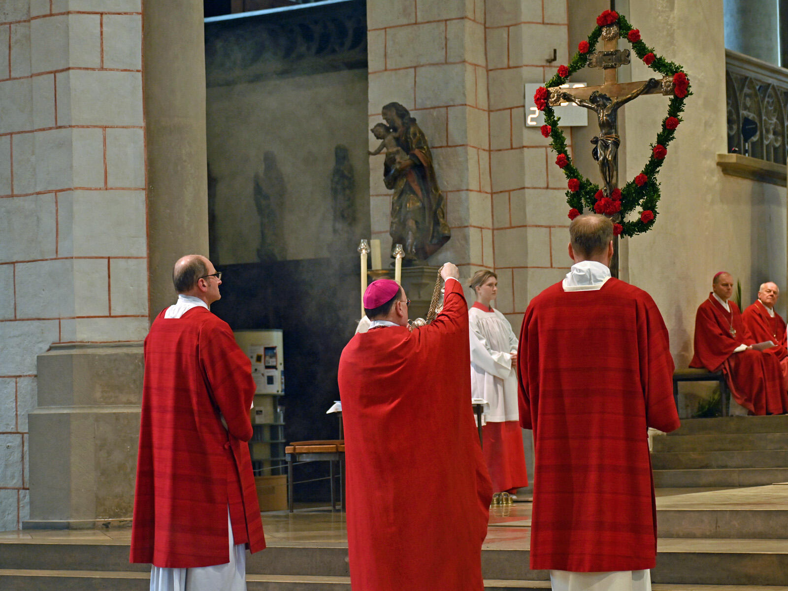 Nach der Statio zog die Gemeinde über den Fronhof, begleitet von dem Lied „Singt dem König Freudenpsalmen“, zum Dom zurück. In der anschließenden Messfeier wurden im Vortrag der Passionsgeschichte das Leid und der Tod Christi als deutlicher Kontrast zum feierlichen Einzug in Jerusalem bereits vorweggenommen. Bischof Bertram stellte in seiner Predigt dann auch die Frage nach dem letztendlichen Sinn des heutigen Festtags.