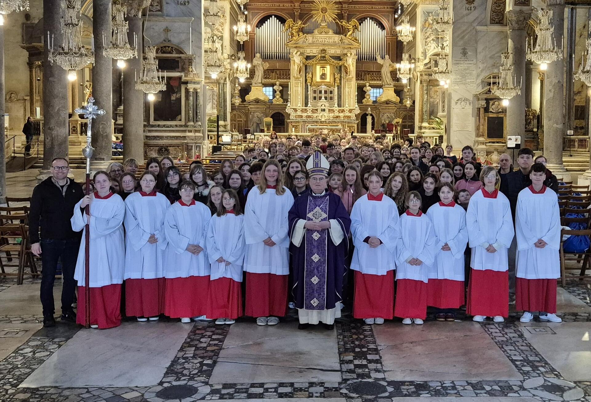 Ein weiterer Höhepunkt der Wallfahrt neben dem Besuch des Petrusgrabes war der Gottesdienst mit Bischof Dr. Bertram Meier in der römischen Kirche Santa Maria in Aracoeli. Der Bischof erzählte davon, dass er selbst viele Jahre in Rom gelebt habe und die Stadt deshalb gut kenne. Er freute sich, dass die Schülerinnen und Schüler dort bei schönem Wetter so viele Eindrücke sammeln konnten. Einen so starken Wolkenguss wie an diesem Donnerstagvormittag habe er hier allerdings noch nie erlebt. In seiner Predigt ermutigte er die Jugendlichen, selbst „Salz der Erde“ zu sein, Verantwortung zu übernehmen und sich von Schwierigkeiten oder Rückschlägen nicht entmutigen zu lassen, sondern stets als Schulgemeinschaft zusammenzustehen.