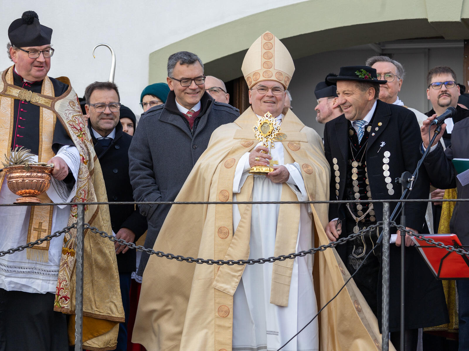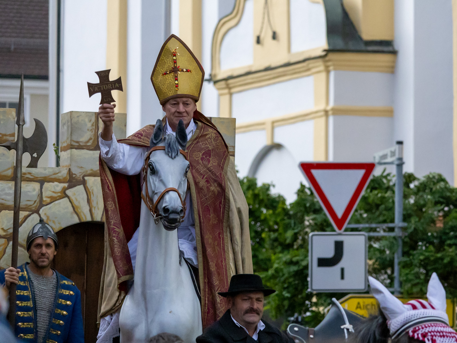 Nach dem Festgottesdienst in der Pfarr- und Wallfahrtskirche St. Leonhard nahm Bischof Bertram gemeinsam mit dem als Ehrengast anwesenden Staatsminister Dr. Florian Hermann, Dekan und Ortspfarrer Stefan Gast sowie zahlreichen weiteren Vertretern von Politik, Kirche und Gesellschaft am traditionellen Leonhardiritt durch Inchenhofen teil. Zwischen über 200 Pferden, zahlreichen Musikkapellen und altbayerischen Trachtengruppen wurde dabei auf rund zwanzig Festwägen in „lebenden Bildern“ die Geschichte der Inchenhofener Leonhardiwallfahrt von den Lebzeiten des Heiligen selbst über die Ursprünge der Wallfahrt im 13. Jahrhundert bis hin in die jüngste Vergangenheit dargestellt. Eine Besonderheit war dabei heuer eine Darstellung des heiligen Ulrich im ihm gewidmeten Festjahr der Diözese.