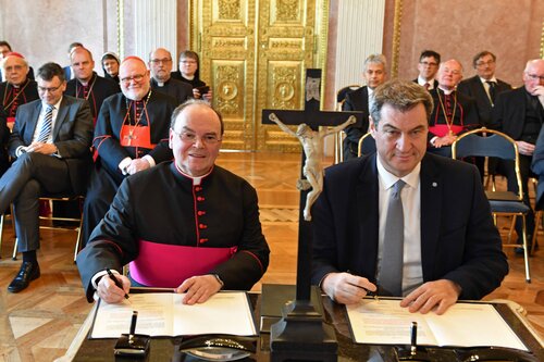 Der ernannte Bischof stellte zudem auf ein facettenreiches Miteinander zum Wohle der Menschen ab. Angefangen von Kindertagesstätten und dem Schulwesen bis hin zum Sozialbereich und kirchlichen Stiftungen. Die Kirche nehme bei ihrem Dienst für Gott und an den Menschen auch gesellschaftliche Aufgaben wahr, für die sie seit alters her Leistungen des Staates, so genannte Dotationen, erhalte. In diesem Zusammenhang sicherte er zu, die Diözese Augsburg werde wie schon bisher angemessene Angebote zur Ablösung dieser Dotationen oder für deren verwaltungsmäßige Vereinfachung annehmen.