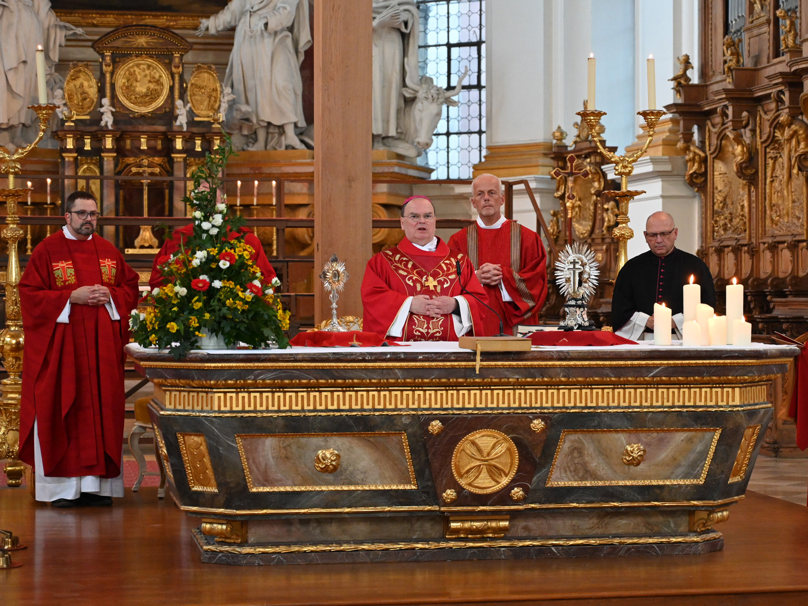 Deshalb stellte Bischof Bertram der Festgemeinde in der Basilika auch eine ganz konkrete Frage: „Denken wir überhaupt noch etwas, wenn wir ein Kreuz sehen beziehungsweise an einem Wegkreuz vorbeigehen – bewegt sich etwas in uns? Sprechen wir ein Gebet, halten wir kurz inne oder verneigen wir uns für einen Moment?“ Viele Menschen wollten sich diesem Anblick nicht allzu lange aussetzen, weil der Gekreuzigte die menschliche Haltung der Wehrlosigkeit so überdeutlich verkörpere. Dennoch verbinde allein das Kreuz Himmel und Erde miteinander.