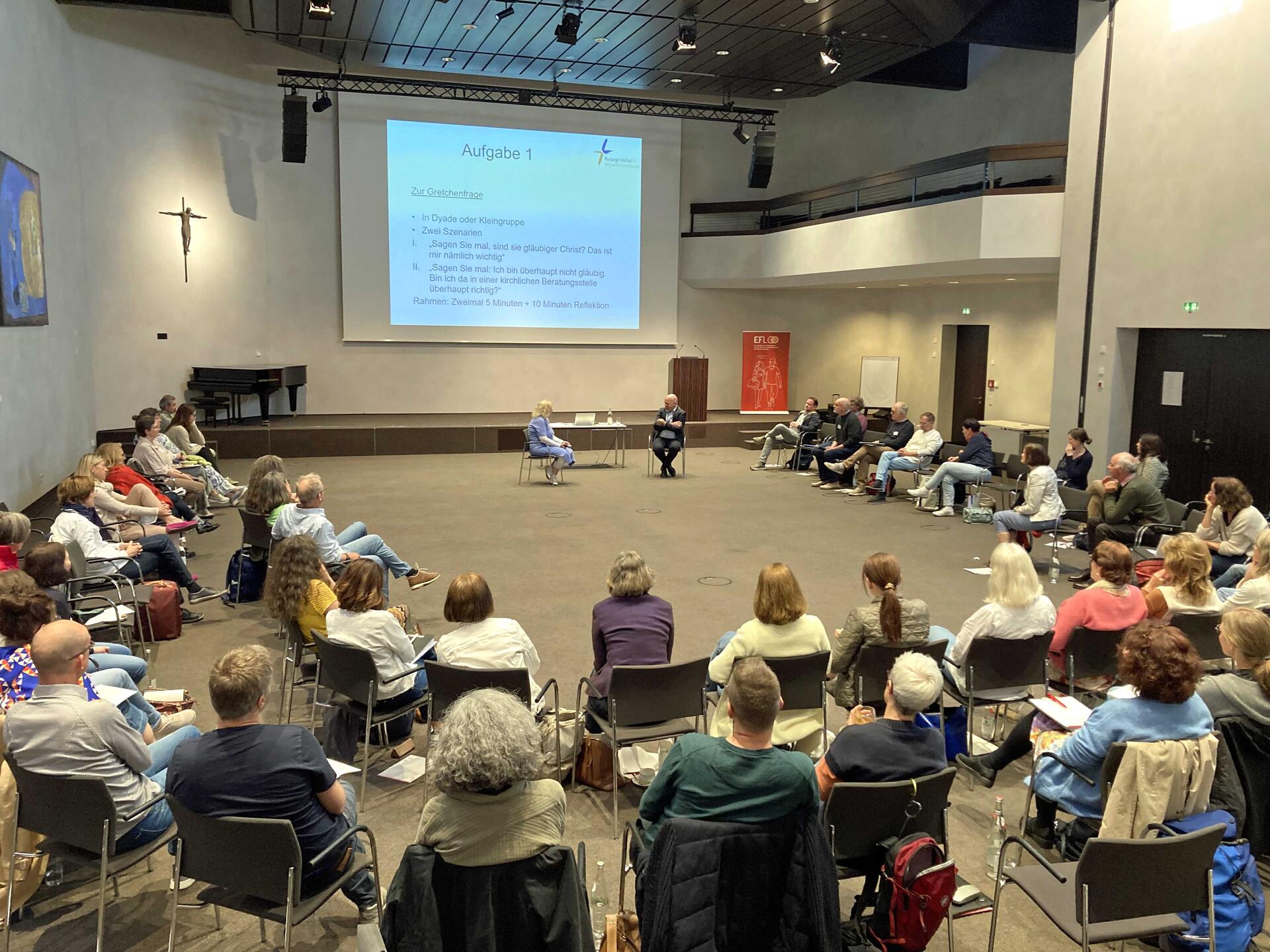 Dr. Gabriela Grunden und Jonas Weinzierl - beide beim Erzbistum München und Freising zuständig für Spiritualität beziehungsweise Exerzitien - begleiteten die EFL-Mitarbeitenden bei einer spirituellen Selbsterfahrung. Die Worte „Wo bist du?“ als Klage gegenüber Gott veränderten in einem Poetry-Slam ihre Reihenfolge zu „wo du bist,…“ und man spürte, dass mit diesem zweiten „du“ nun jeder und jede selbst gemeint war. Die Klage gegenüber Gott wandelte sich zu einer Aufforderung an sich selbst: „Übernimm Verantwortung, …da, wo du bist!“