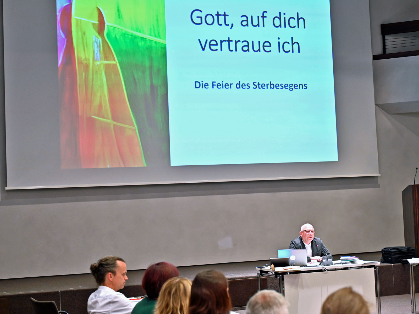 Im Zentrum der Fortbildung stand der Vortrag von Domvikar Ulrich Müller, dem Leiter des Fachbereiches für Liturgie im Bischöflichen Ordinariat. Er stellte die Segensfeier ganz allgemein den anwesenden Seelsorgerinnen und Seelsorgern vor und verortete diese dann auch liturgisch und pastoral im Bereich der Sterbebegleitung. Andere Bistümer in Deutschland hätten bereits Ablaufvorschläge für den Sterbesegen entworfen, die in der Regel neben dem zentralen Sterbesegen mit Kreuzzeichen auf Stirn und Hände auch Gebete, Kyrierufe, einen Lesungstext und das Vater unser vorsähen. Eine Besonderheit besteht darin, dass die möglicherweise anwesenden Angehörigen auch in die Feier eingebunden werden können, indem diese ebenfalls den Sterbenden segnen dürfen.