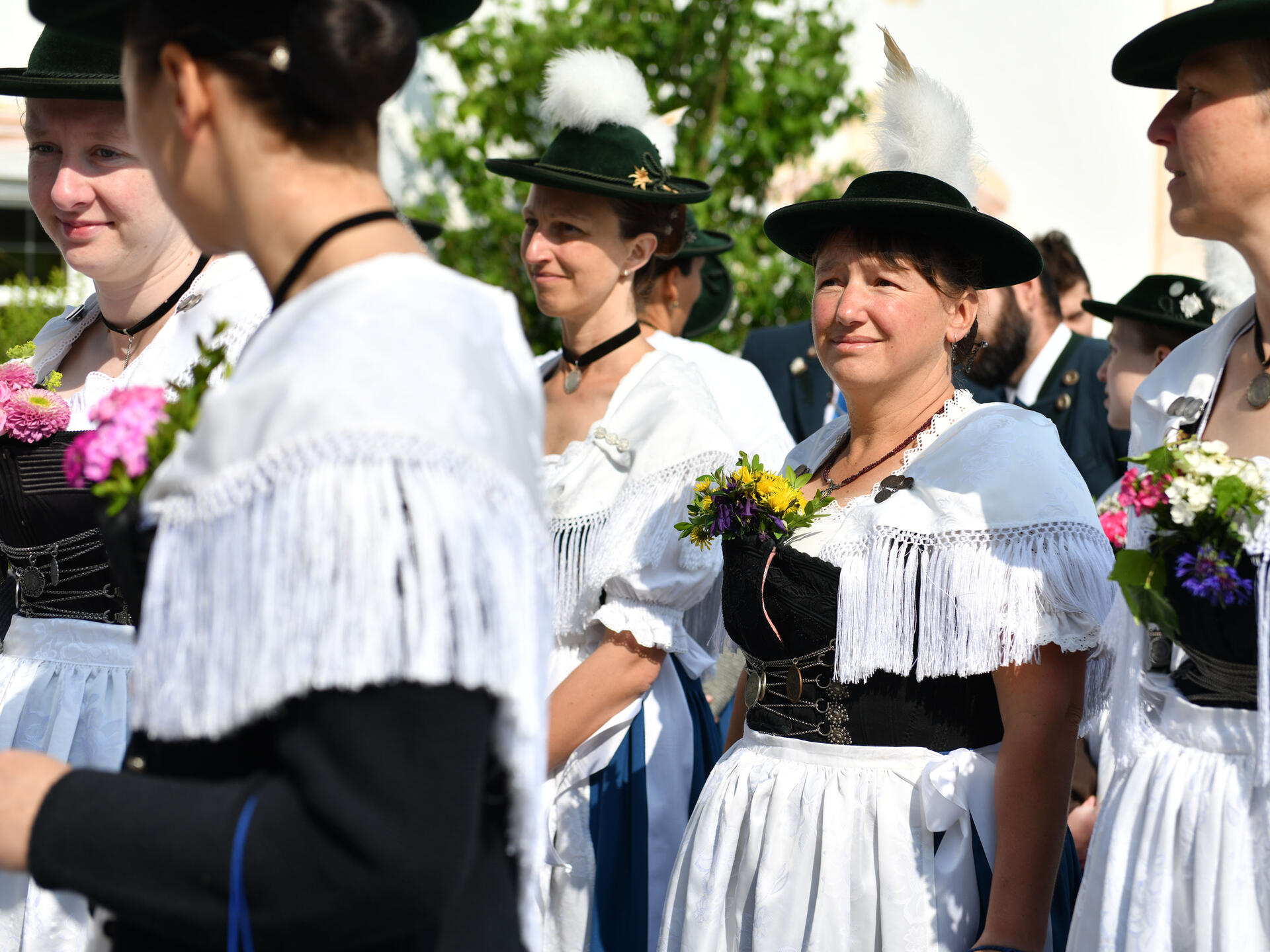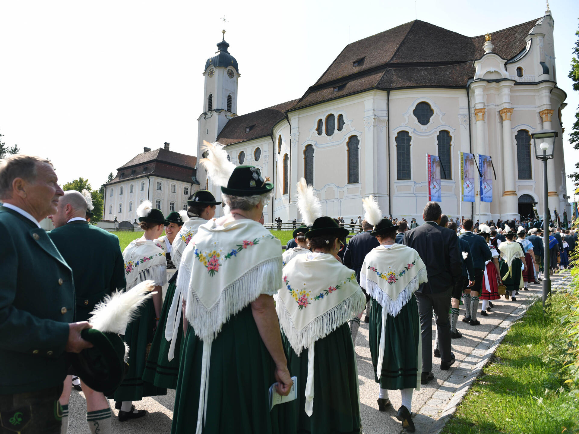 Bereits vor dem Festgottesdienst waren die Frauen und Männer aus 23 verschiedenen Trachtenvereinen des Oberen Lechgaus in ihren festlichen Trachtengewändern und begleitet von zahlreichen Fahnenabordnungen in einem farbenfrohen Zug der Wallfahrtskirche entgegengegangen. Betend zogen sie in die Wieskirche ein und wurden dort von feierlichen Klängen empfangen. Alpenländische Lieder und Zithermusik prägten sodann auch den gesamten Gottesdienst.