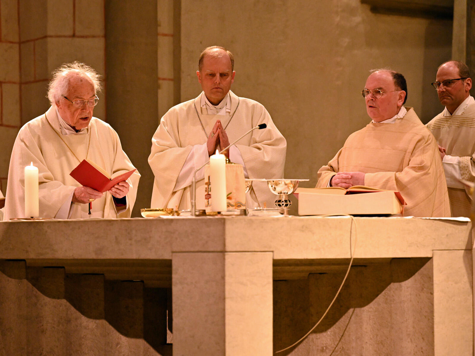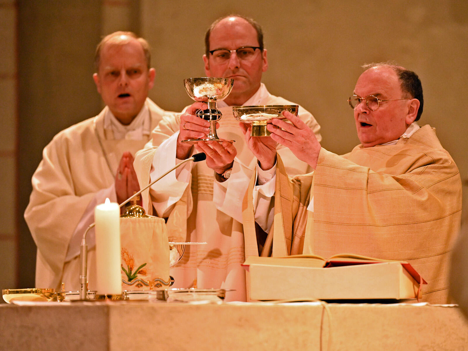 In der Feier der Eucharistie werde jedes Mal aufs Neue deutlich, dass die Bindung Jesu zu seiner Kirche nicht abbreche. Selbst der Tod beende diese Gemeinschaft nicht. Jesus sei mit Leib und Blut auf dem Altar nach katholischer Glaubenslehre „real präsent“, also ganz und gar „für uns da“. Und doch würde im Moment des Hochgebetes mehr passieren: „Nicht nur Wein und Brot werden verwandelt, auch wir können uns wandeln. Wir selbst bleiben nicht, was wir vorher waren.“ Genau deswegen sei die Feier des Abendmahls auch mehr als ein Leichenschmaus, „der bald zweitausend Jahre nach denselben Ritualen abläuft.“ Christus selbst spreche die Einladung hierfür aus. Für die Gläubigen gehe es aber nicht an das Buffet vieler religiöser Angebote, „es gehe an den Tisch des Herrn, zum Mahl des Lammes.“