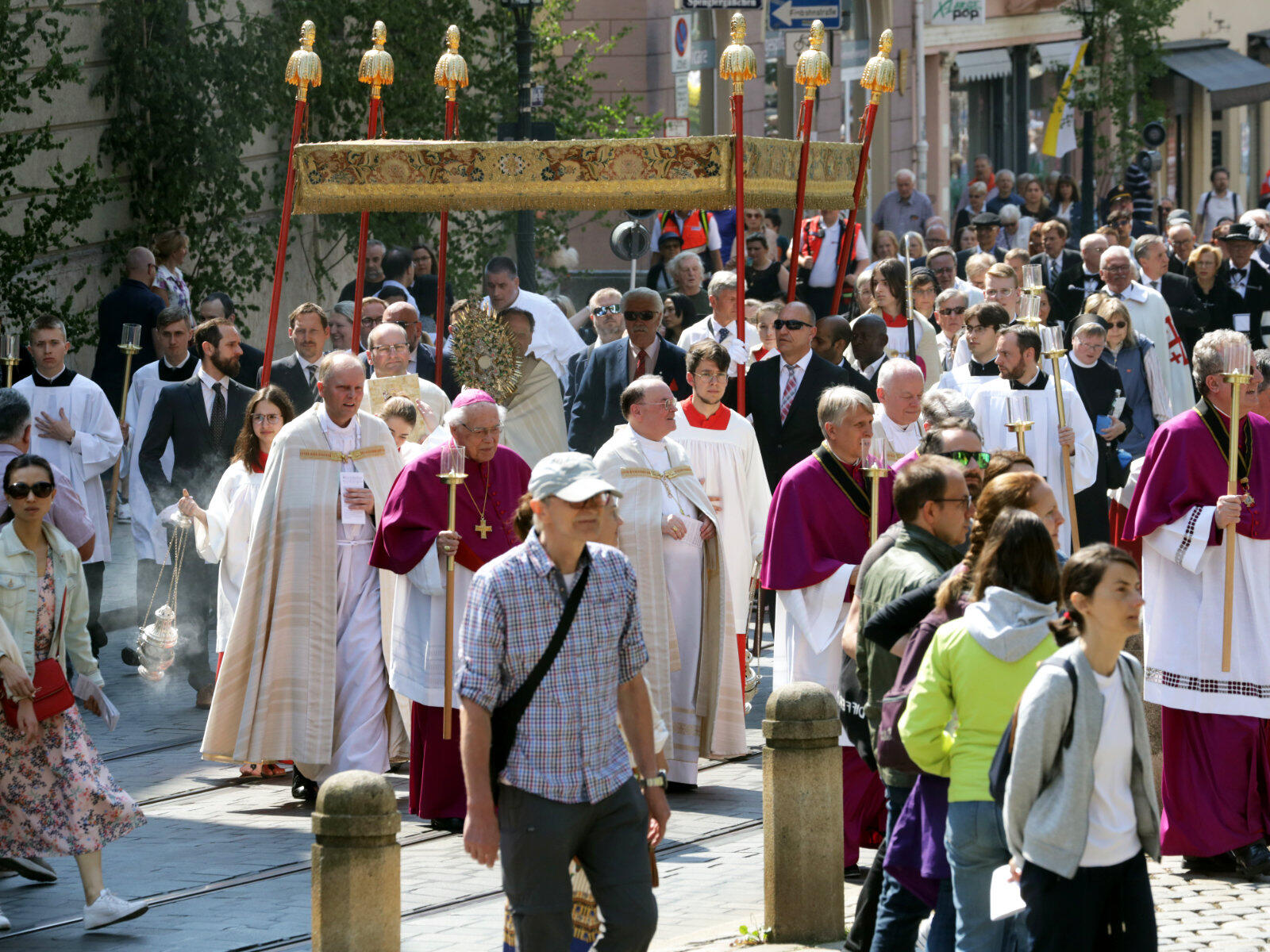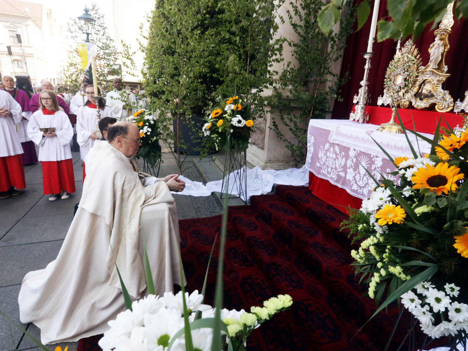 Die traditionelle Fronleichnamsprozession berge aber noch einen weiteren Sinneskern in sich: „An Fronleichnam zeigt sich synodale Kirche - eine Gemeinschaft, die wie eine Wandergruppe unterwegs ist durch unsere Stadt“, so der Bischof. Die Kirche zeige damit nach außen, dass sie in Bewegung ist und bleibe – doch sei dies keine zufällig-chaotische Bewegung in alle Richtungen hin, sondern ein gemeinsames Gehen mit und zum Herrn und damit eine Einladung an alle: „Nehmt Jesus mit! Er geht mit Euch!“ Und so sei es nur folgerichtig, dass die Prozession auch in der eucharistischen Anbetung münde: „Anbetung ist verlängerte Danksagung. Denn wenn der Herr sich uns schenkt, dann kann der Empfang der Hostie nur heißen: das Knie vor ihm beugen, ihn großmachen, ihn anbeten.“