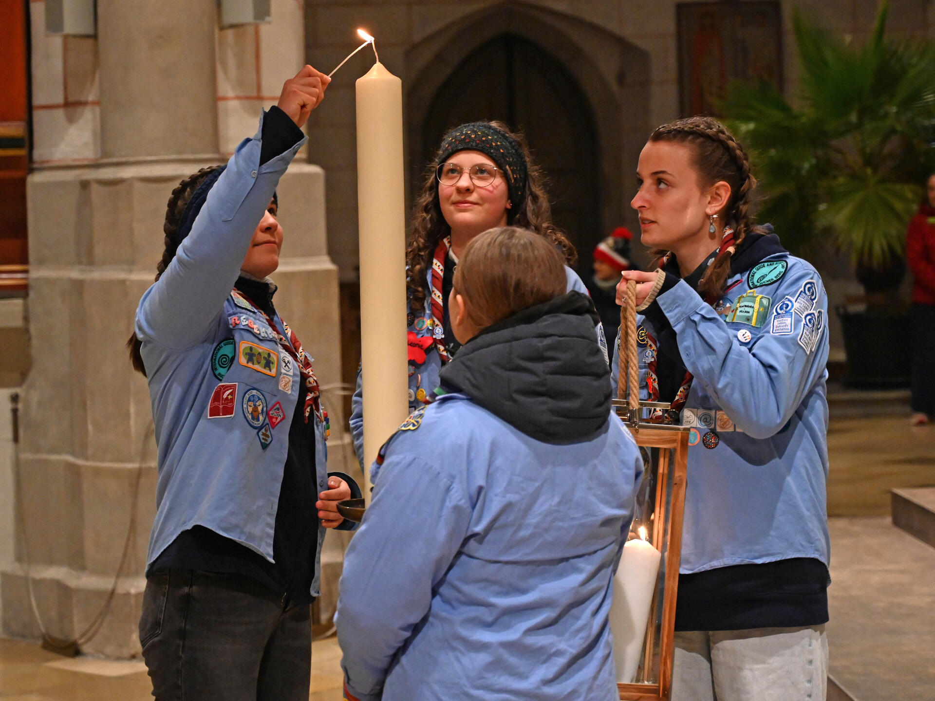 Der Wunsch nach Frieden vereint Menschen jeder Nation und Religion, das wurde am Sonntagnachmittag bei der Aussendungsfeier des Friedenslichtes erneut deutlich. Die Mitglieder der Pfadfinderinnenschaft Sankt Georg gestalteten hierfür gemeinsam mit BDKJ-Diözesanpräses Florian Stadlmayr einen weltoffenen und bunten Gottesdienst im Augsburger Dom. In seiner Predigt betonte der Präses, dass die Betonung von Unterschieden Konflikte hervorrufe.