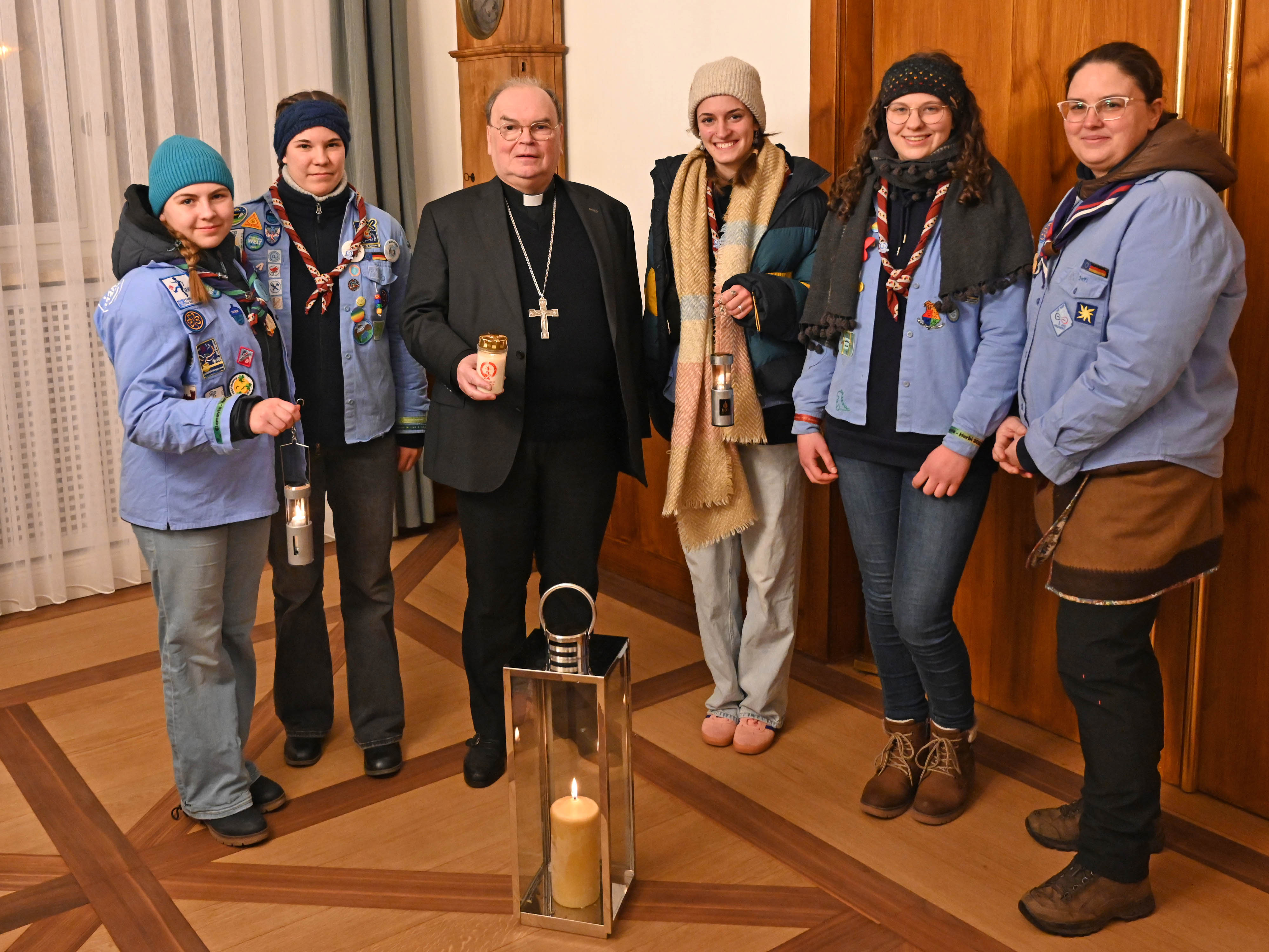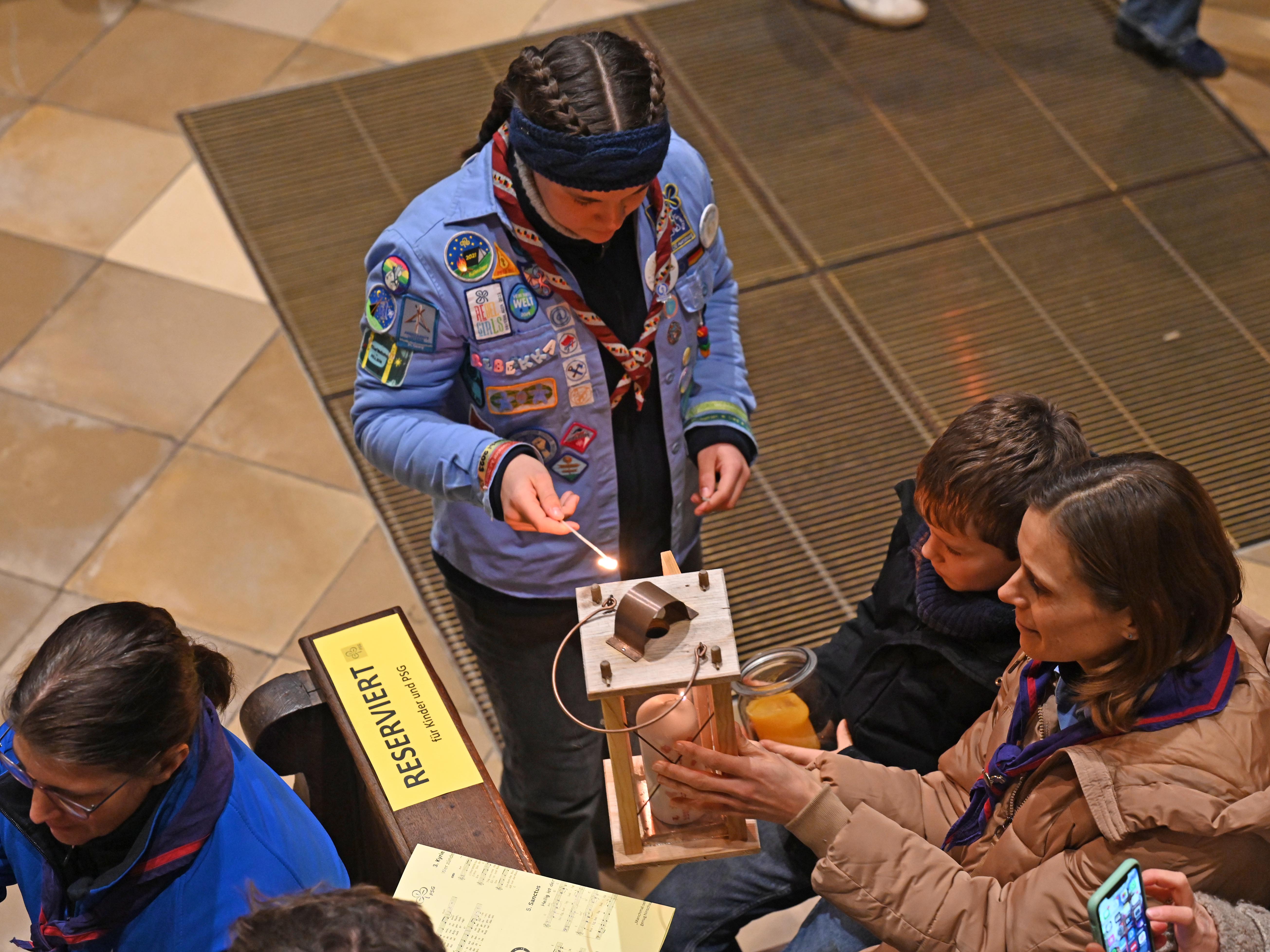 Im Anschluss an die Aussendungsfeier im Dom bekam auch Bischof Dr. Bertram Meier das Friedenslicht überreicht. Dabei betonte er, dass wir auch aktuell in der Gesellschaft oft von Dunkelheit umgeben seien. „Deshalb brauchen wir Lichtträger wie die Pfadfinderinnen und Pfadfinder.“, so der Bischof.