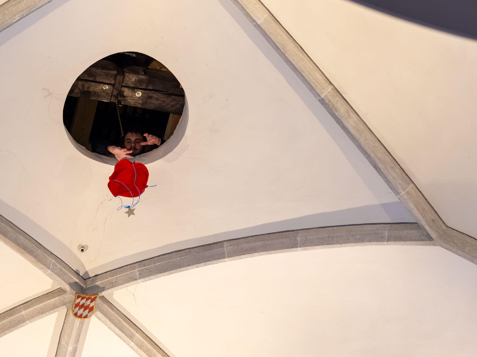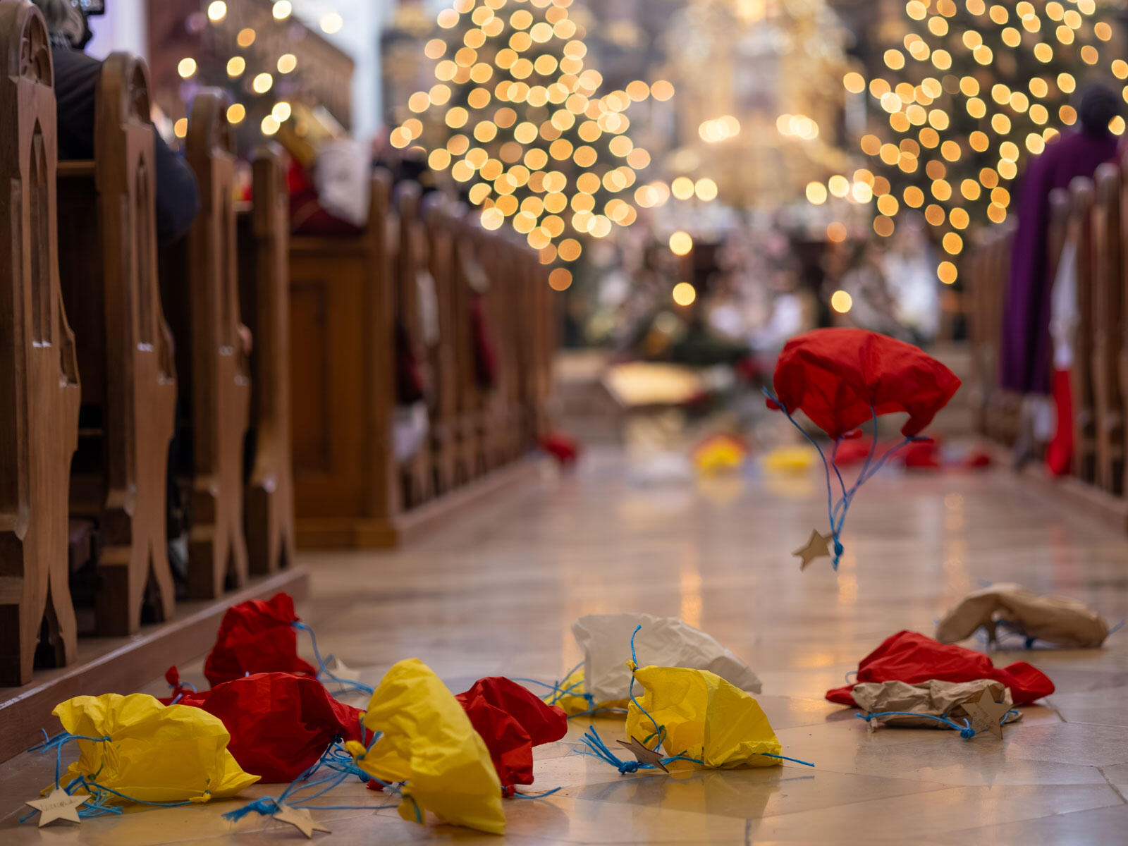 Am Ende des feierlichen Gottesdienste kamen dann wieder die im Pfarrzentrum gebastelten und von den Kindern mit ihren eigenen Segenswünschen beschriebenen Fallschirme zum Einsatz, als sie durch zwei Öffnungen in der Kirchendecke herabgelassen wurden und zu Boden segelten: Sterne der Hoffnung, die zu den Menschen hinuntersteigen. Mit dem bischöflichen Segen für Kreide, Weihrauch und natürlich die Sternsingerinnen und Sternsinger selbst ging die Eröffnungsaktion zu Ende und wurden die Kinder und Jugendlichen damit offiziell ausgesandt, um den Segen Gottes an die Haus- und Wohnungstüren der Menschen zu bringen.
