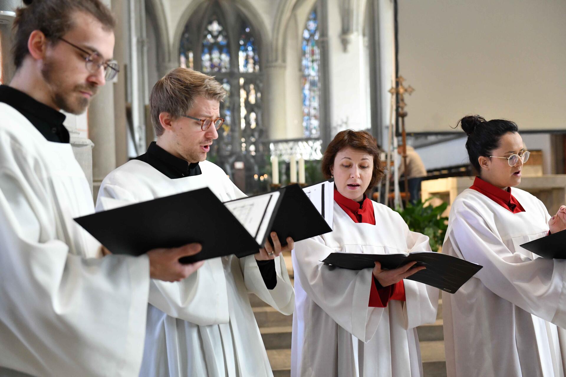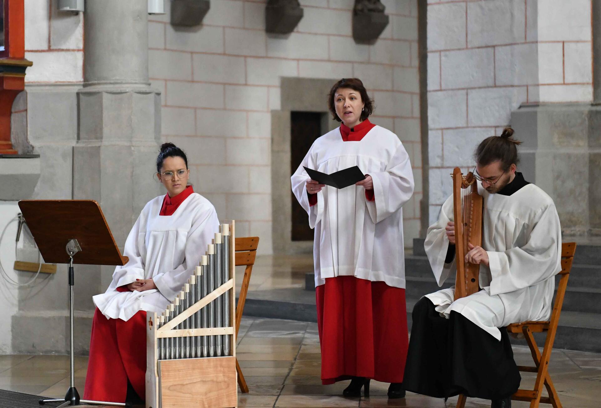 Augsburg (pba). Die Künste des Mittelalters haben den heutigen Aschermittwoch der Künstler im Hohen Dom zu Augsburg wie eine Klammer umspannt. Den Mittelpunkt bildete ein Vortrag von Kunsthistorikerin und Privatdozentin Dr. Dorothea Diemer, die über das mittelalterliche Bronzeportal des Doms sprach. Dem Vortrag ging ein feierlicher Gottesdienst mit Diözesanadministrator Prälat Dr. Bertram Meier und den Weihbischöfen voraus. Begleitet wurde dieser vom Chor „The Obsidian Collective“ sowie von Männerstimmen der Augsburger Domsingknaben. Sie stellten die Anfänge der Mehrstimmigkeit zur Zeit der ottonischen Renaissance musikalisch vor.