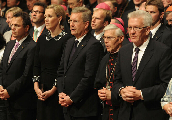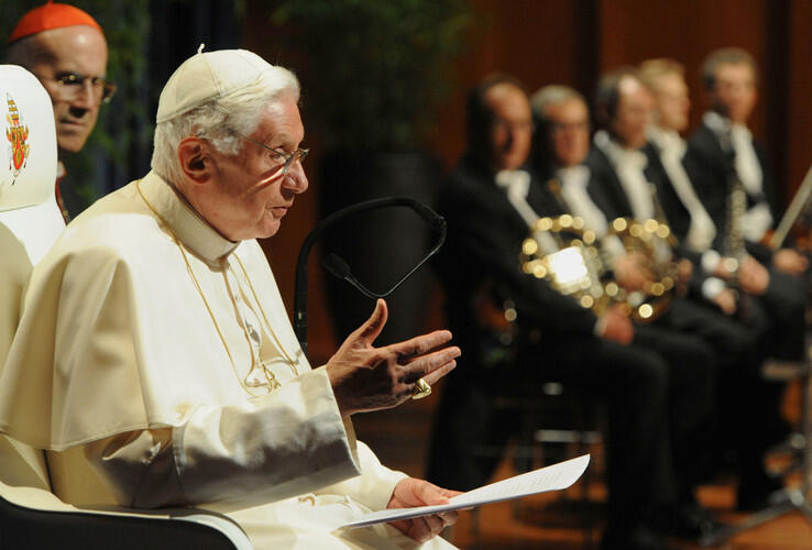 Freiburg (dbk). Papst Benedikt XVI. hat am Sonntagnachmittag im Freiburger Konzerthaus davor gewarnt, die Botschaft des Evangeliums zu relativieren und sich zu sehr „den Maßstäben der Welt“ anzugleichen. Vor rund 1.400 Gästen und in Anwesenheit von Bundespräsident Christian Wulff und seiner Frau sprach er von der Gefahr, dass „die Kirche sich in dieser Welt einrichtet“ und „selbstgenügsam“ wird. Durch die Ansprüche und Sachzwänge der Welt werde immer wieder das Zeugnis verdunkelt. Organisation und Institutionalisierung dürften für die Kirche kein größeres Gewicht erhalten als ihre Sendung. Um diese zu verwirklichen, müsse die Kirche „immer wieder auf Distanz zu ihrer Umgebung nehmen“ und sich gewissermaßen „ent-weltlichen“.