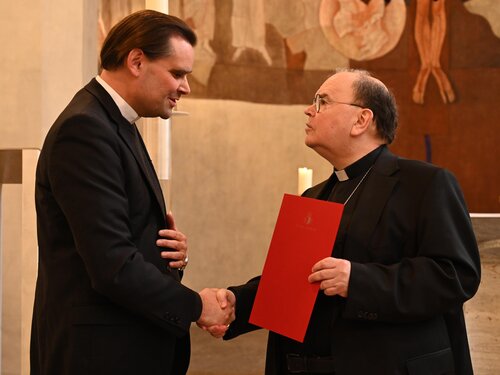 „Der Weg wächst im Gehen unter unseren Füßen wie durch ein Wunder“, stellte Bischof Bertram ein Sprichwort aus dem romanischen Sprachgebrauch als passendes Motto über die Andacht und wandte sich mit persönlichen Worten an den scheidenden Präses: „Du bist jahrzehntelang wallfahren gegangen und warst als Pilger der Hoffnung viel unterwegs. Beim Wallfahren warst Du ganz in Deinem Element. Die Pilgerreise auf Erden wird hoffentlich noch lange weitergehen. Bleib weiterhin mit und für uns unterwegs. Das ist mein Wunsch für Dich.“