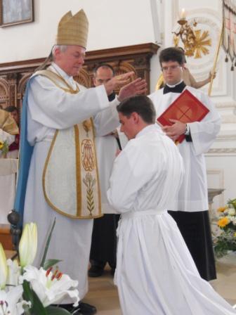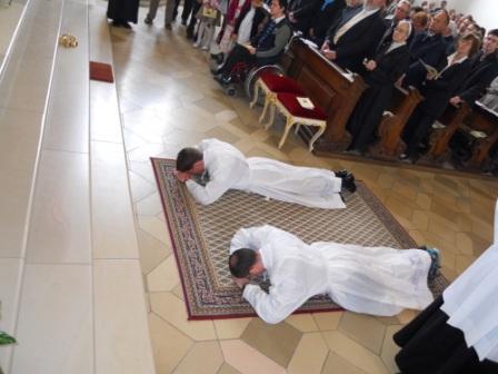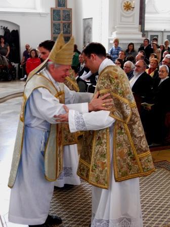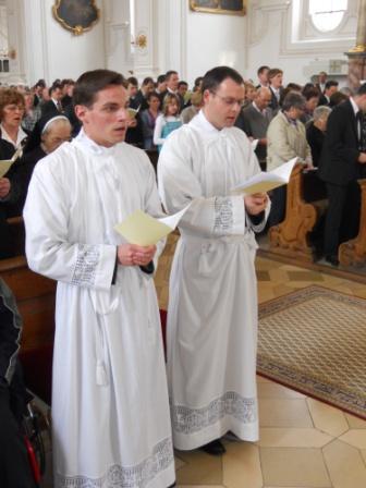 Informationen zur Liturgie der Diakonenweihe: Zu Beginn der Messfeier erklären die Weihekandidaten ihre Bereitschaft, sich zu Diakonen weihen zu lassen. Zum Versprechen der Weihekandidaten treten diese vor den Bischof und bekunden ihre Bereitschaft, ihr ganzes Leben an Jesus Christus auszurichten. Sie versprechen, in ungeteilter Liebe zu Christus zu leben und ihm in der Hilfe insbesondere für Kranke und Notleidende zu dienen, ehelos zu leben und gegenüber dem Bischof gehorsam zu sein. Die Kandidaten legen sich während der anschließenden Allerheiligenlitanei als Zeichen der Demut vor den Altar. Es folgt die Weihe: Der Bischof legt jedem der vor ihm knieenden Männer schweigend die Hände auf als Zeichen der Beauftragung und der Mitteilung der Kraft des Heiligen Geistes. Im darauf folgenden Weihegebet des Bischofs findet die Weihe ihre Vollendung. Die Neugeweihten Diakone bekommen die Stola umgelegt und erhalten anschließend die Dalmatik. Sie knien nun noch einmal einzeln vor dem Bischof nieder, der Ihnen das Evangeliar überreicht. Zum Abschluss umarmen der Bischof und gegebenenfalls die anwesenden Diakone die Neugeweihten zum Zeichen der Aufnahme in das neue Amt und die Gemeinschaft der Diakone.