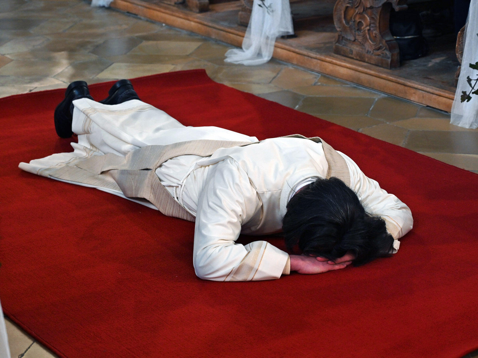 Nach dem Gesang der Allerheiligenlitanei empfing Frater Franziskus durch Handauflegung, Gebet und Salbung die Priesterweihe. Abt Hermann Josef Kugler OPraem, dem das Kloster Roggenburg untersteht, versprach der Neupriester Ehrfurcht und Gehorsam. Im Anschluss feierte er gemeinsam mit Bischof Bertram und dem Chorherrenkonvent die Eucharistie.