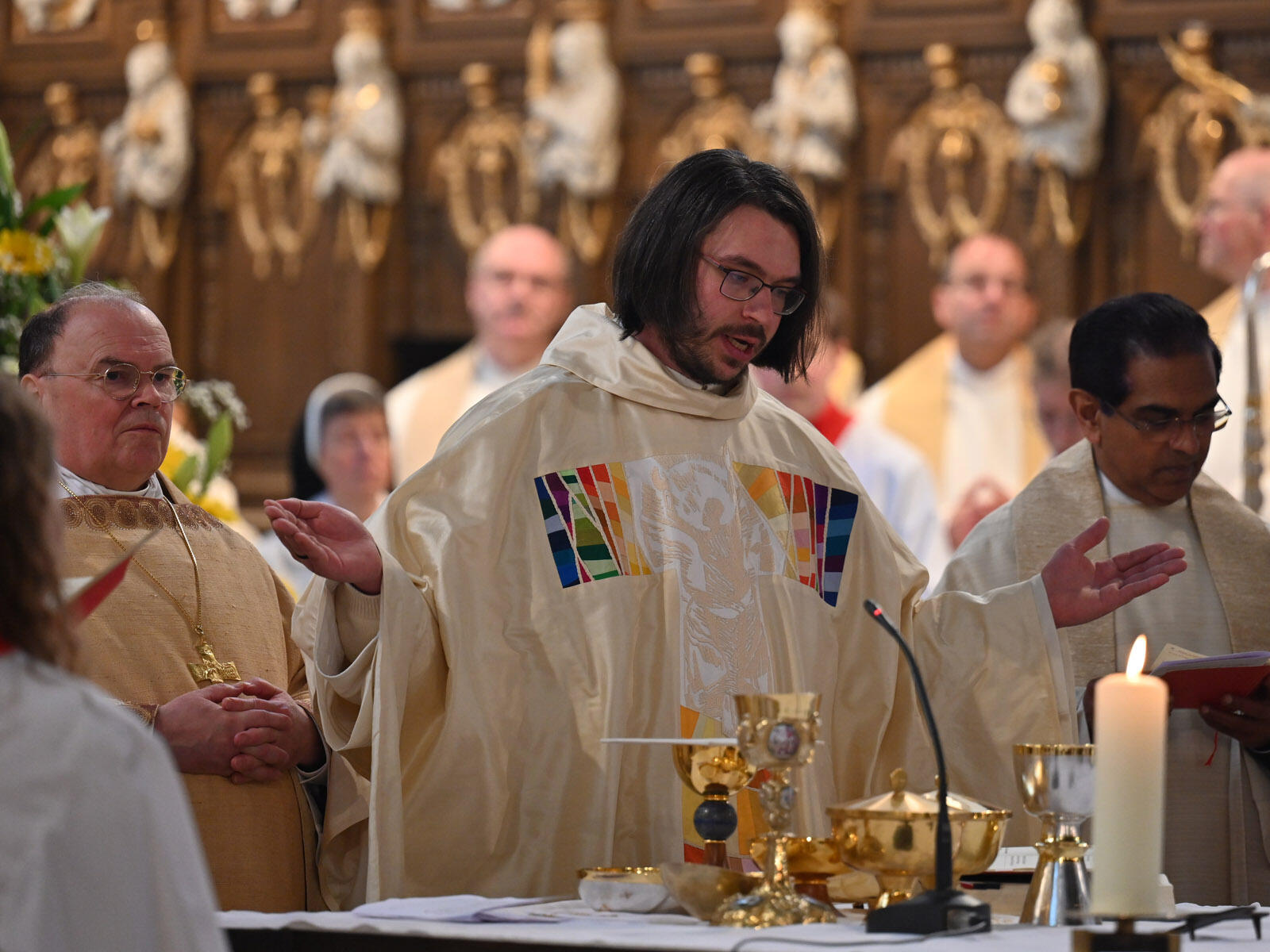 Auch heute müssten sich angehende Priester fragen, ob sie den Anforderungen gewachsen seien und sich wirklich für die Kirche engagieren wollten. Als Ordensmitglied gebe man auch noch viel der persönlichen Freiheit zugunsten des Gehorsams auf. Bischof Bertram: „Es ist nicht leicht, die eigene Lebensgeschichte so zu schreiben, dass sie sich einfügt in eine größere Geschichte.“ Nur wer die eigenen Bedürfnisse gegenüber dem Anspruch Gottes zurückstelle, könne einen Glauben leben, der das eigene Leben verändere. Zum Ende seiner Predigt zitierte er daher auch ein Gebet aus der Ostkirche: „Zwischen uns soll nichts mehr sein. Lass mich zu dir kommen. Gib, dass ich mich versenke, vertiefe in deine Gegenwart. Dein Herz allein spreche zu meinem Herzen.“