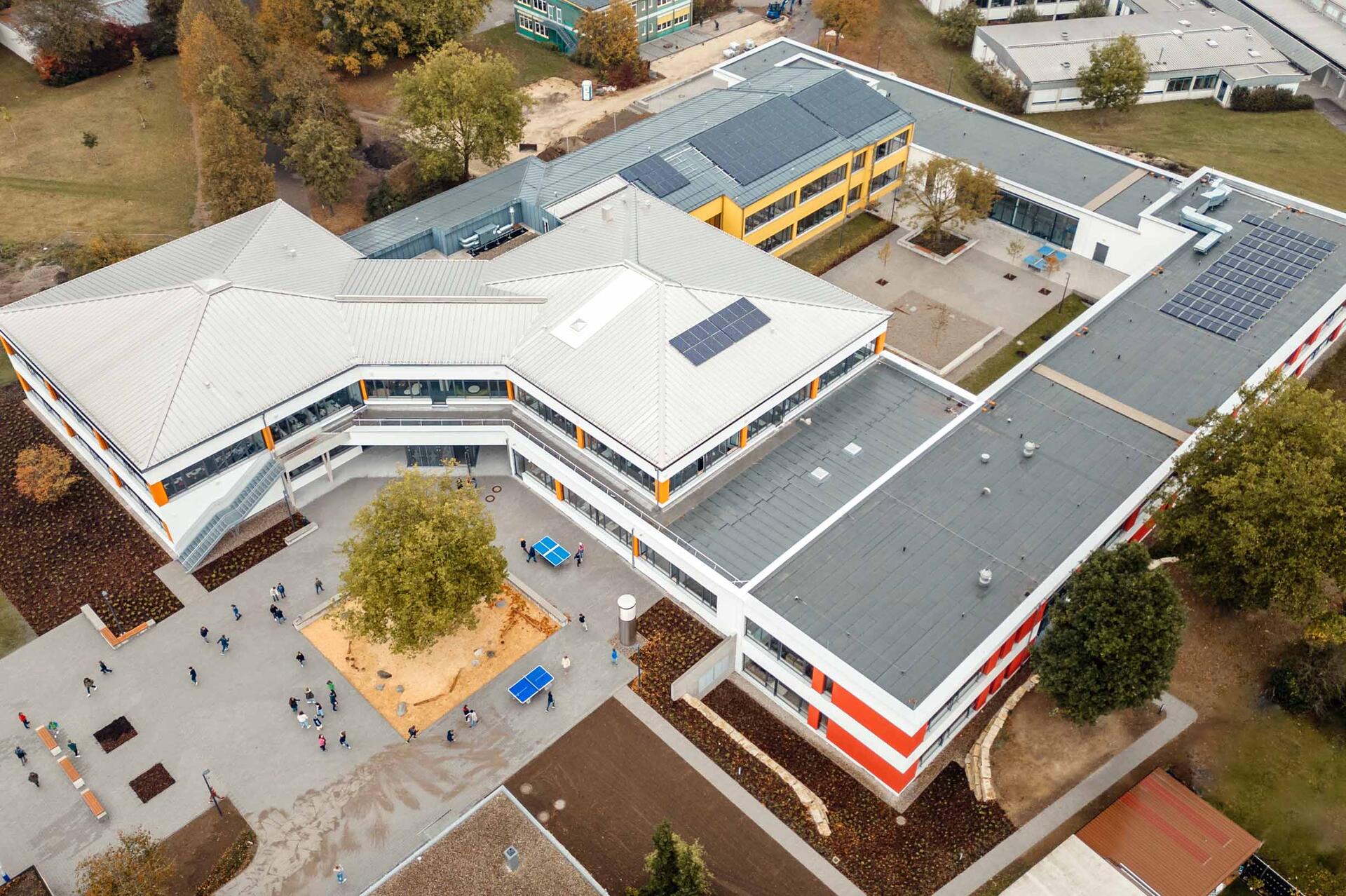 Insgesamt kostete das Bauprojekt 24 Millionen Euro und blieb damit im Kostenrahmen. Durch die Entscheidung, den bestehenden Bau der Realschule Heilig Kreuz beizubehalten und generalzusanieren, konnten im Vergleich zu einem kompletten Neubau rund 800 Tonnen CO2 eingespart werden. Die aktuell knapp 1.000 Schülerinnen und Schüler lernen nun also in besonders nachhaltigen Schulgebäuden.