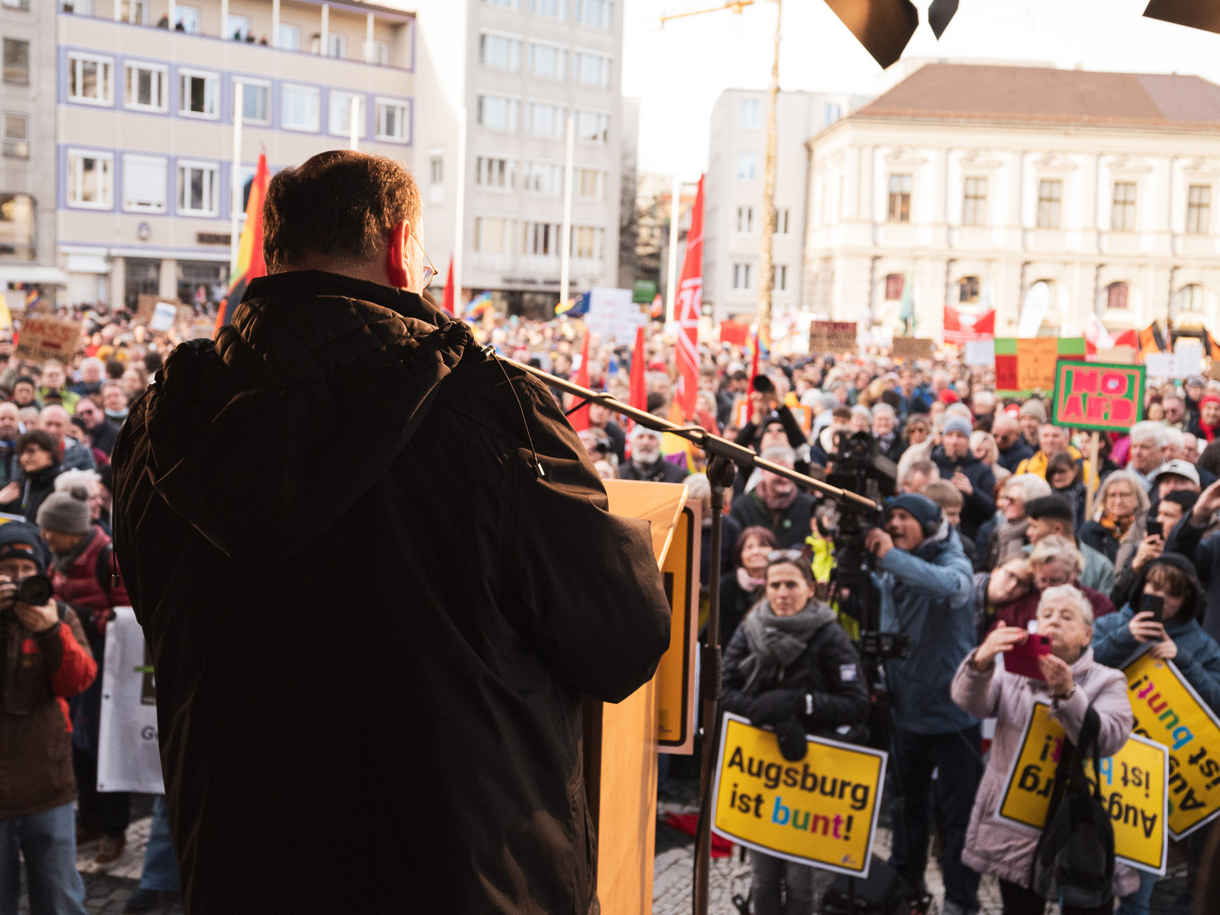 Zu Beginn der Kundgebung hatte die Augsburger Oberbürgermeisterin Eva Weber ein leidenschaftliches Plädoyer für die Demokratie gehalten: „Demokratie, das sind wir alle. Wir alle müssen Haltung zeigen. Wir können uns nicht drauf verlassen, dass es andere tun, wir müssen unsere Demokratie retten und verteidigen."