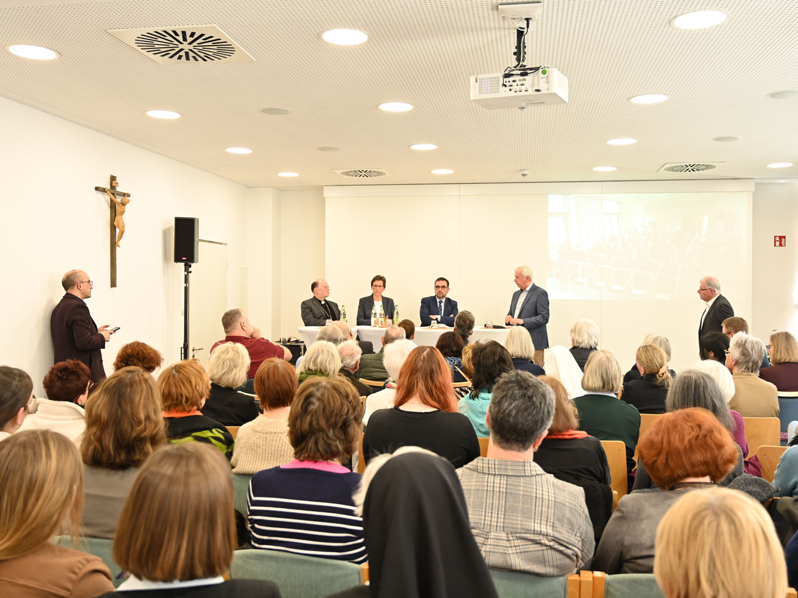 An das Gespräch der Podiumsteilnehmer schloss sich eine angeregte Diskussion beziehungsweise Fragerunde mit den zahlreich erschienenen Zuhörerinnen und Zuhörern an, die selbst vielfach haupt- oder ehrenamtlich in der Sterbebegleitung tätig waren. Aufgrund der großen Teilnehmerzahl wurde die Veranstaltung parallel in den neben dem St. Vinzenz-Hospiz gelegenen Pfarrsaal der Pfarrei St. Martin gestreamt, von wo aus ebenfalls die Möglichkeit zum Fragen stellen gegeben war.